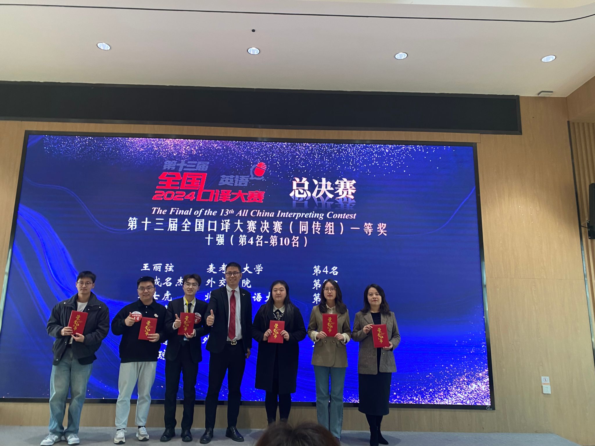 同传组决赛中,2021级翻译本科生章瓦尔获冠军,2023级MTI研究生顾书宁进入十强,获得一等奖(全国第八名),2023级MTI研究生曾轶涵获全国二等奖。交传组决赛中,2021级翻译专业本科生章瓦尔获冠军,2023级MTI研究生熊玺媛进入十强精英赛,获得一等奖(全国第九名)。此外,2023级MTI研究生曾轶涵、李丁一、2022级英语专业本科生徐成成获全国一等奖。