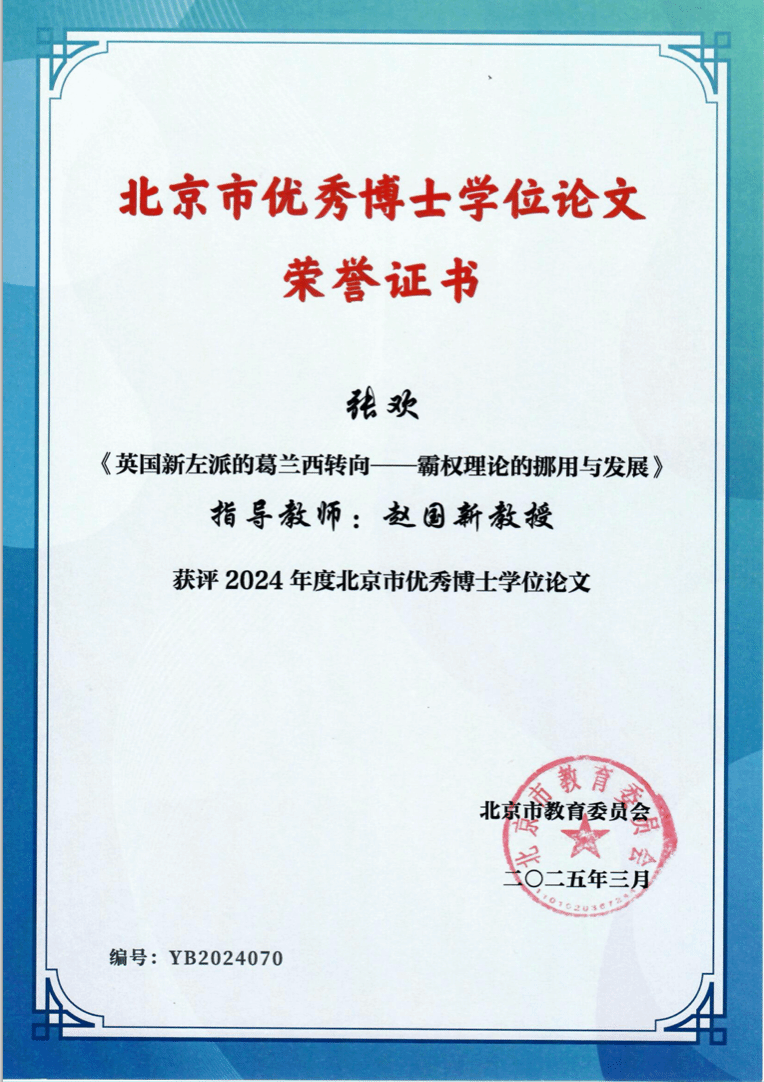 北京市教育委员会、北京市学位委员会最近公布了2024年北京市优秀博士学位论文名单。从这份名单中获悉,北京外国语大学yl23455永利集团2023届博士毕业生张欢的博士学位论文《英国新左派的葛兰西转向霸权理论的挪用与发展》被评为2024年度北京市优秀博士学位论文,指导教师为赵国新教授。