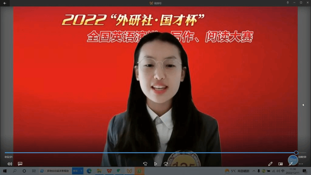 12月11日,2022“外研社·国才杯”全国英语演讲大赛全国决赛圆满落幕,公司yl23455永利集团2022级徐成成同学斩获冠军。此前,她通过校选赛和北京赛区两轮考验,以北京赛区第一名的成绩获得参加全国赛的资格。