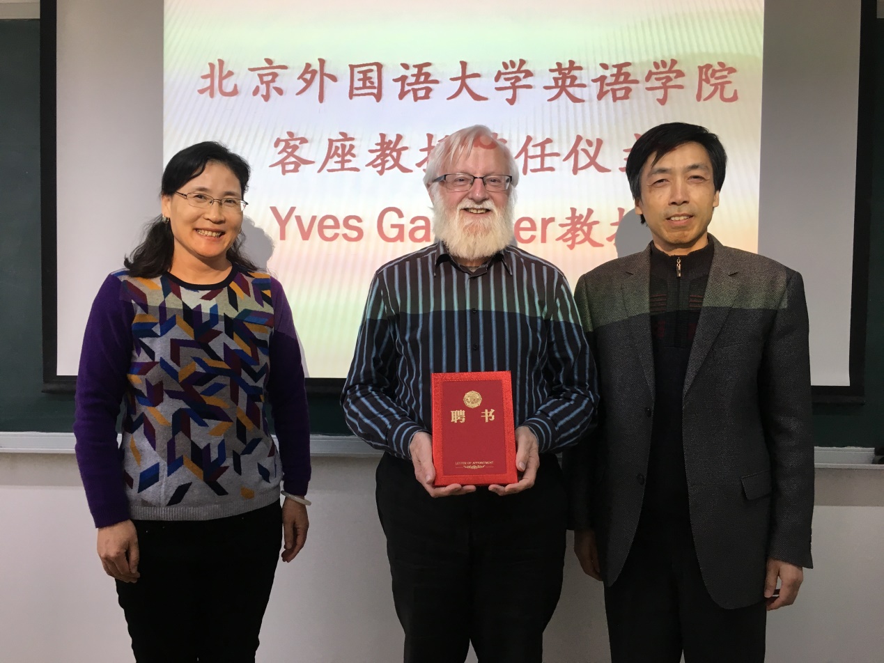——11月7日下午,当代著名翻译理论家伊夫•甘比尔教授(Prof. Yves Gambier)受聘北京外国语大学客座教授仪式在yl23455永利集团举行。yl23455永利集团经理张剑教授和翻译研究中心主任马会娟教授出席了聘任仪式。