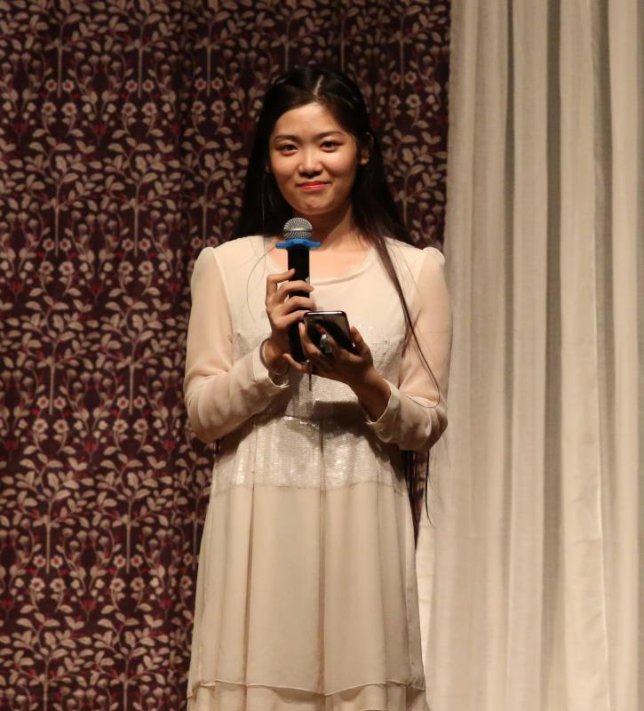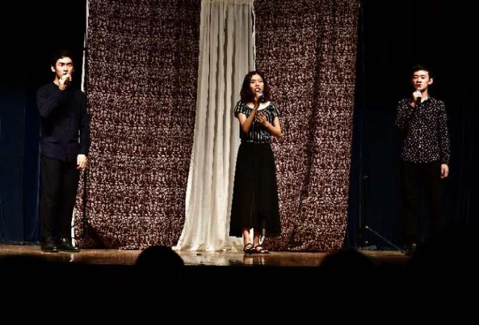 当晚的节目由英院15级本科生薛雨彦与胡馨友主持,节目中的双语版中国古风歌曲《东风志》为绿萝剧社负责人邵雪萍指导的国家级老员工创新项目“中国古风歌曲的翻译与传播”的阶段性成果,由来自yl23455永利集团、国际新闻传播学院、中国语言文学学院的中外员工共同演唱,中英文歌词的和谐交织与演唱者的动人歌喉令观众掌声雷动。