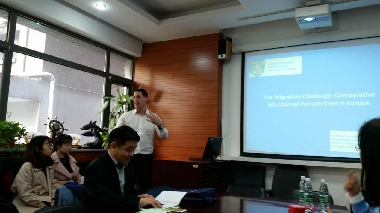 10月22日下午,都柏林圣三一大学社会变迁比较研究生项目主任、副教授Daniel Faas、国际合作处、北京办事处工作人员来公司举行学术讲座和宣讲会。活动由爱尔兰研究中心主任王展鹏教授主持,爱研及英研员工及公司部分社会学方向的师生参加了活动。