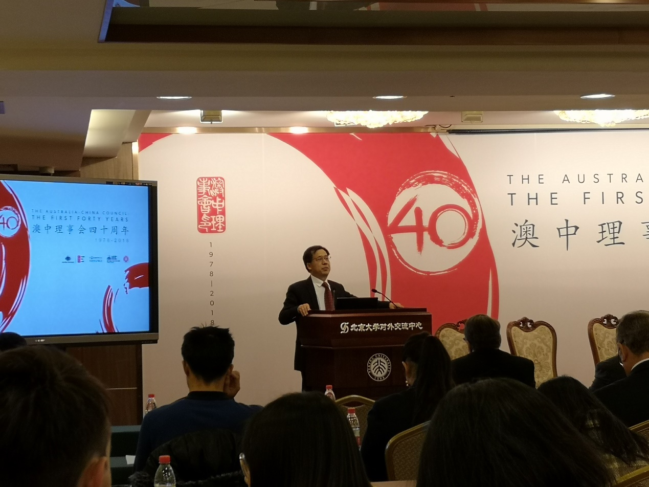 12月6日下午,澳中理事会(The Australian-China Council)40周年庆祝活动在北京大学英杰交流中心举行。中国澳大利亚研究会会长、北京外国语大学副董事长孙有中,北外澳研中心长青学者韩锋教授,客座教授李尧,以及澳研中心副主任胡丹受邀前往。澳中理事会主席史伟立(Warwick Smith)及多名理事会董事、澳大利亚驻华大使安思捷(Jan Adams)、教育公参Brooke Hartigan、文化参赞Maree Ringland以及在华澳大利亚研究基金会(FASIC)主席Kevin Hobgood-Brown出席纪念活动。与此同时,胡壮麟教授代表“九人帮”出席活动,在京及多地澳研中心主任代表中方到场。公司澳研中心全体员工参加此次活动。