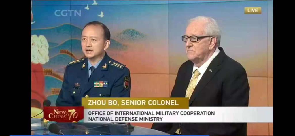 10月1日,马克林教授受邀参加CGTN国庆特别节目的直播,以外国专家的身份阐述新中国成立70周年来中国日新月异的巨大变化,并就中国当前军事外交政策与中国国防部国际军事合作办公室安全中心主任周波进行探讨。