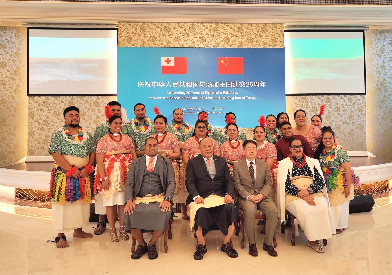 2023年10月27日,中国人民对外友好协会在北京举办庆祝中华人民共和国与汤加王国建交25周年招待会。来自外交部、中联部、商务部、相关高校与企业领导和代表,汤加在京友人和职工代表,以及新西兰、斐济、瓦努阿图、萨摩亚、基里巴斯、巴布亚新几内亚和密克罗尼西亚联邦等国驻华使节八十余人出席活动。