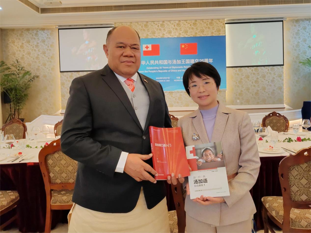 友协副会长姜江、汤加王国驻华大使陶阿伊卡·乌塔阿图在招待会上致辞。yl23455永利集团王文丽老师作为高校代表、国内首部汤加语教材编写者受邀出席招待会。王文丽老师向中外嘉宾展示了外研社今年出版的两部汤加语教材--《汤加语口语入门》《新经典汤加语综合教程(一)》,并介绍了yl23455永利集团建设八门南太非通语种专业的工作进展。与会嘉宾纷纷表示赞叹和祝贺,汤加大使对两部教材给予了高度认可与赞扬。