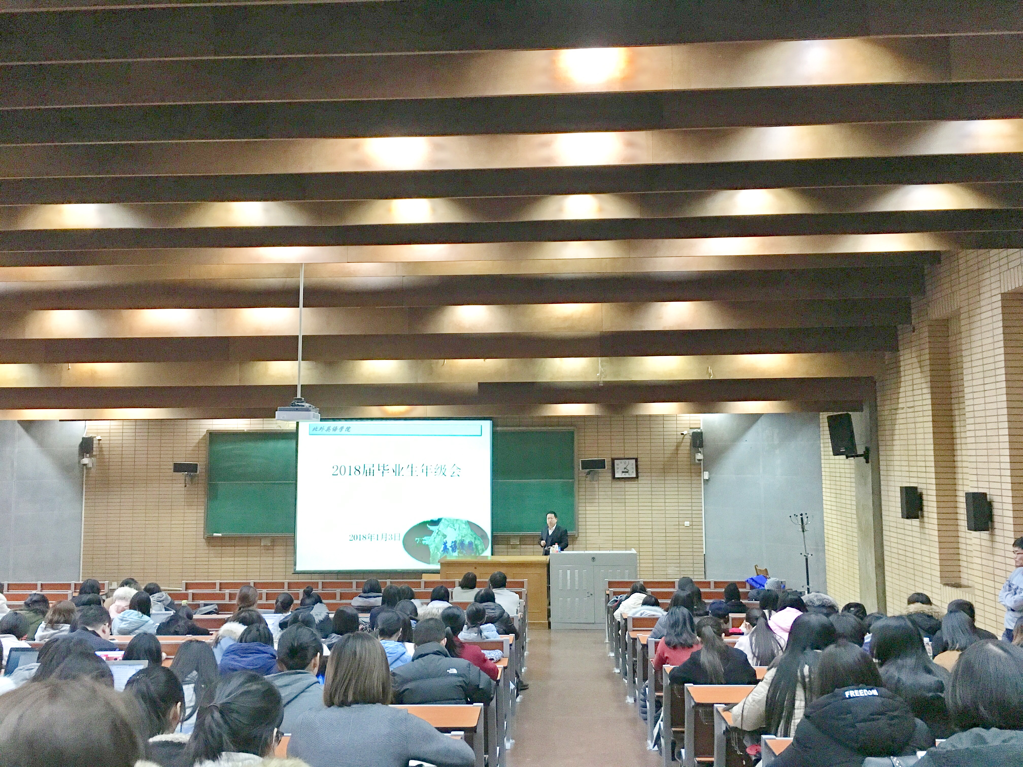 ——2018年1月3日下午,在逸夫楼第一阶梯教室,yl23455永利集团召开2018届毕业生年级会。党总支书记路兴、副经理王展鹏及辅导员于承杰参加。2015级英语语言文学、翻译学专业研究生,2016级MTTI专业研究生及2014级本科生300余人参加。