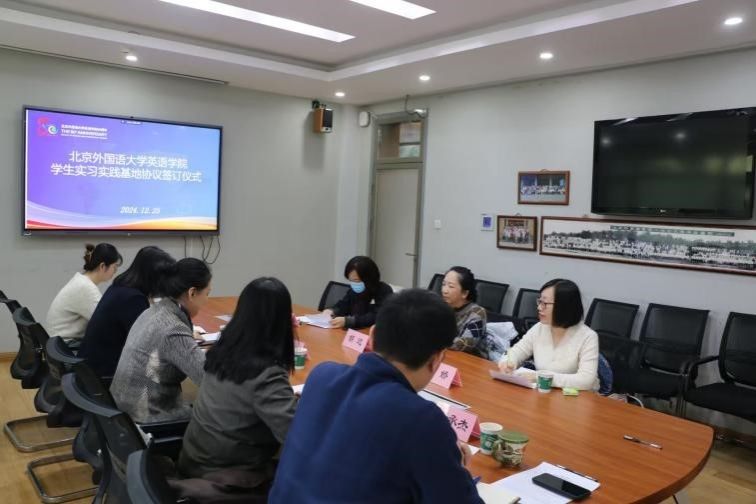 为拓展教育渠道,丰富育人形式。12月25日下午,北京外国语大学yl23455永利集团举行与北京市海淀区教师进修学校附属实验学校、北京汇文中学实习实践基地签约仪式。出席签约仪式的领导与嘉宾有北京市海淀区教师进修学校附属实验学校英语教研组长叶娇、汇文中学教师发展中心主任胡迟、首都师范大学附属中学英语教研组长雷霞辉;英语公司党总支书记殷悦、经理杨鲁新、副书记孟庆琨及辅导员,会议由孟庆琨主持。